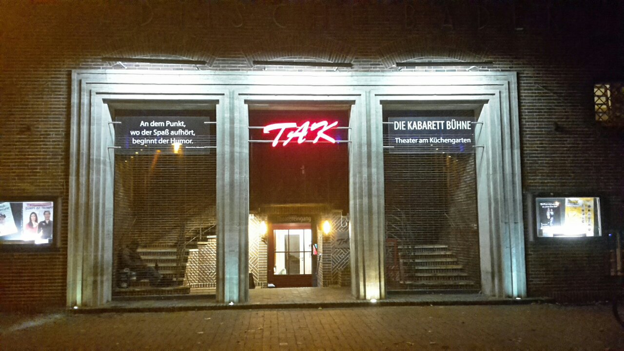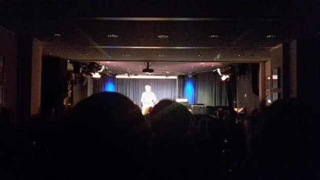 Eine halbe Stunde später gehen wir an der netten Frau am Eingang, die wir schon mehrmals nervös passiert haben, vorbei. Sie nickt uns nett zu. Oben im Showsaal stehen Samtstühle, die alten Legenden aus dem Apollokino, in vielen Reihen um die kleine Bühne verteilt. Die Kellner, allesamt edel gekleidet, bringen auf Tabletts Essen zum dem größtenteils erwachsenen Publikum. Irgendwie fühlt man sich hier als Jugendlicher ein bisschen fehl am Platz. Jedoch auch ein wenig Stolz im Anbetracht der Tatsache, dass wir ihnen anscheinend sehr kultiviert vorkommen. Wo doch Jugendliche ihrer Meinung nach immer nur muffig in ihren Zimmern hocken und sich wie gefährliche Tiere verhalten.
