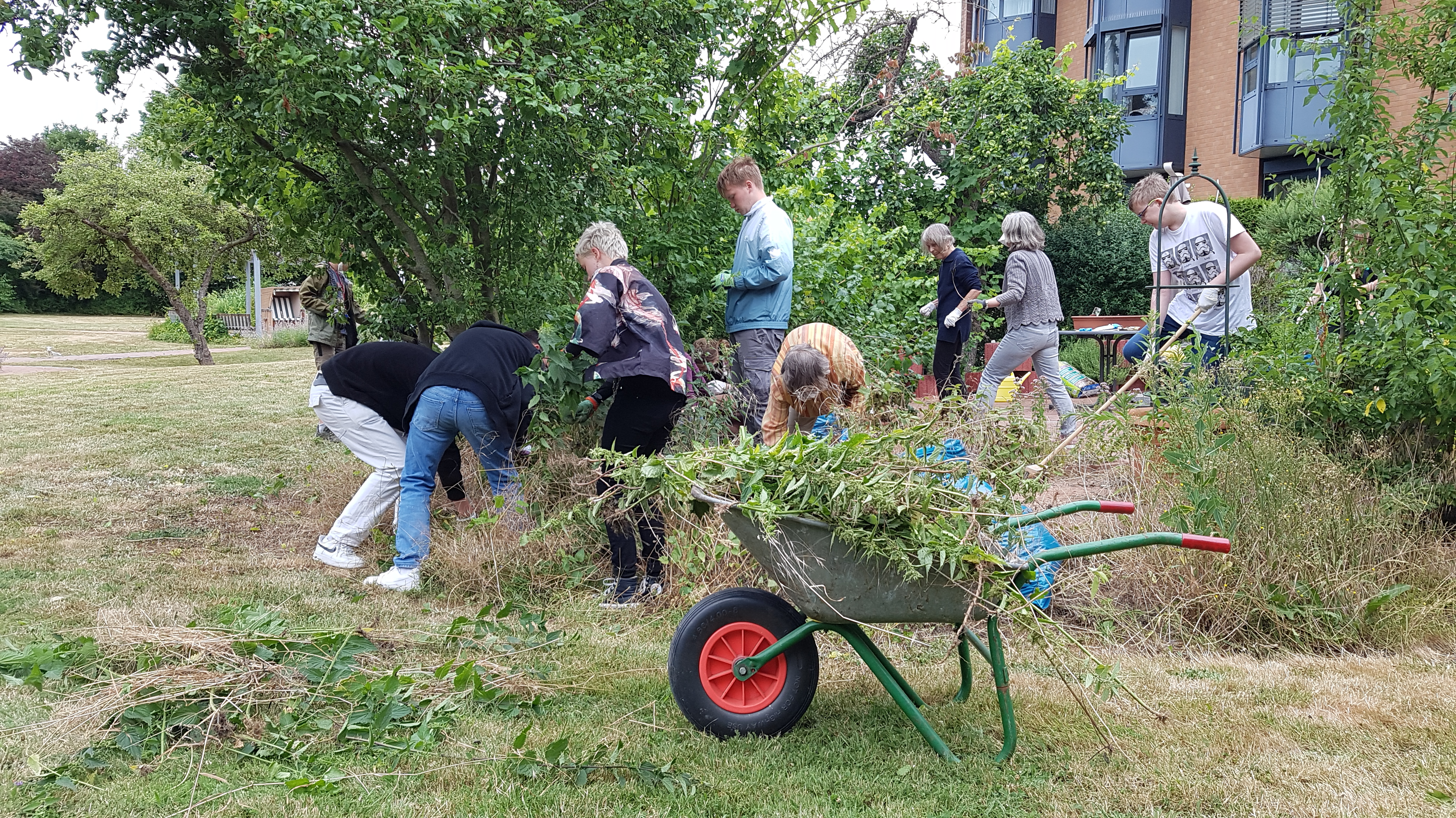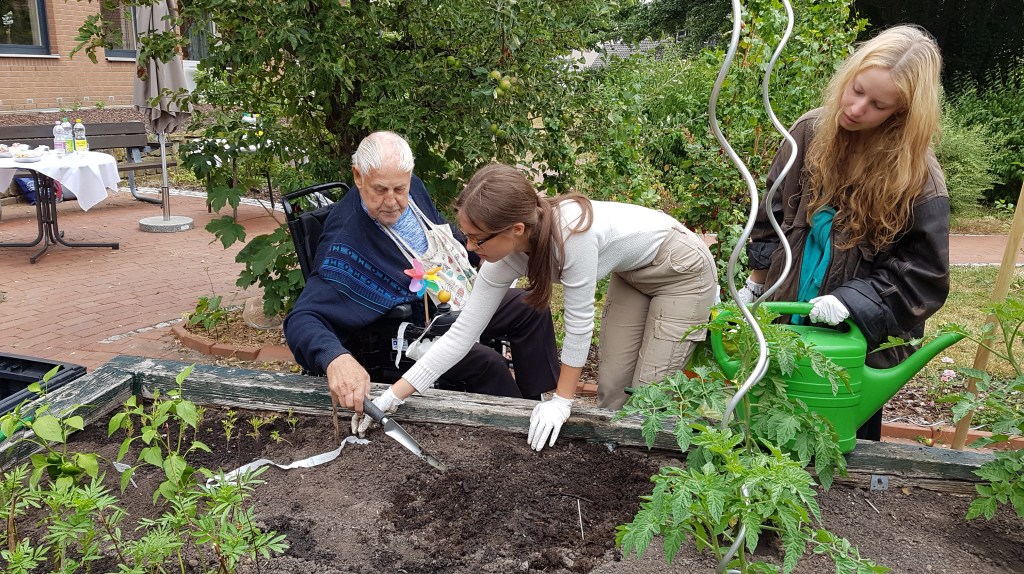 Als wir dann in den Garten der Anlage geführt wurden, ging es auch direkt mit der Arbeit los: Unkraut zupfen und Pflanzen pflanzen. Kurz darauf kamen auch schon die Bewohner, die uns tatkräftig halfen, sowohl physisch als auch mental. Es wurde gesungen, gerätselt und gespielt, es war ein wunderbarer Vormittag, an dem Einschränkungen überwunden, und Brennnesseln gezupft wurden.