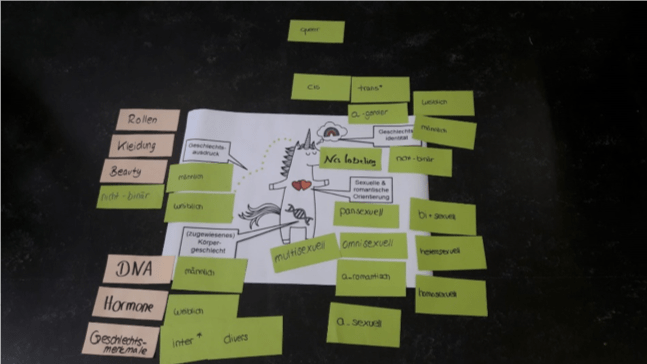 Bei dieser Mitmachaktion durften sich die Schüler*innen je nach Belieben einen der auf den grünen Zetteln stehenden Begriffe nehmen oder einen Begriff hinzufügen und diesen dann zu einer der vier Sprechblasen des sogenannten Gender Unicorns legen. Danach wurden sämtliche Begriffe noch einmal durchgegangen und besprochen, um niemanden mit ungeklärten Fragen zurückzulassen. In dieser Fragerunde ist man, wie auch im restlichen Workshop, absolut offen und so einfühlsam wie möglich aufeinander eingegangen. Denn ein vorschnelles Verurteilen führt oft zu Misskommunikation und daraus resultierenden Vorurteilen.