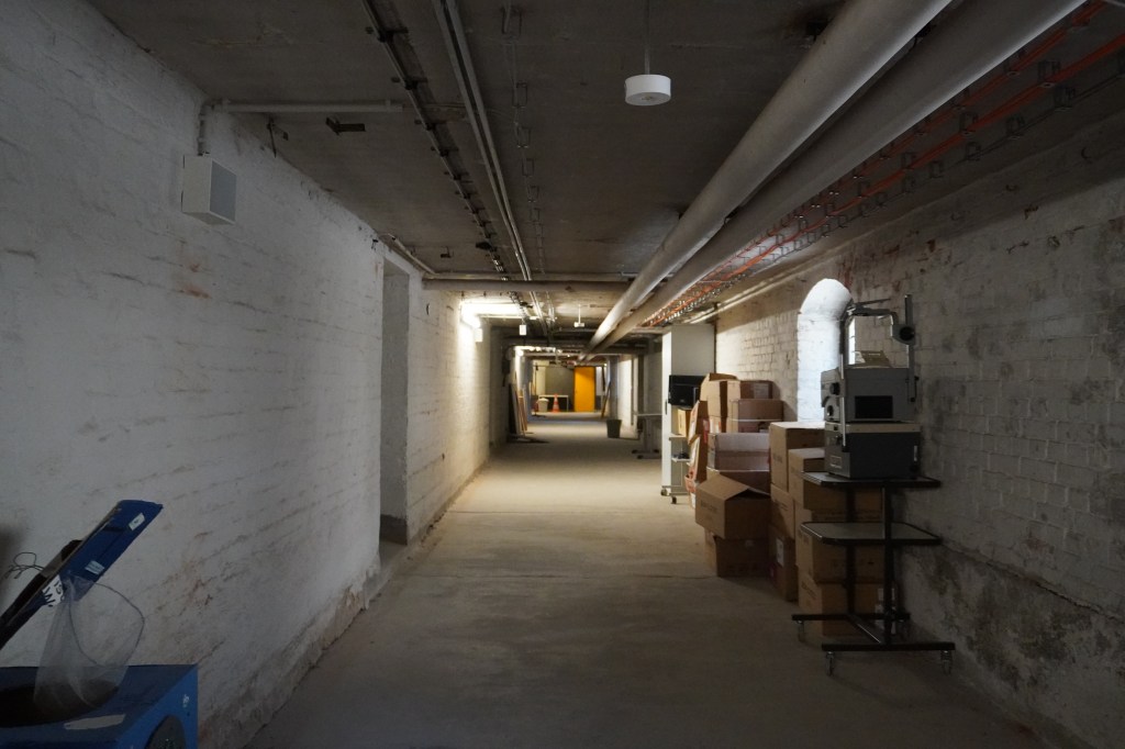 Die Tür geht auf und das einzige, was man sieht, ist schwarz. Ein greller Lichtblitz und das Licht ist an. Wir gehen langsam die Treppe runter und schauen in einen langen großen Gang: