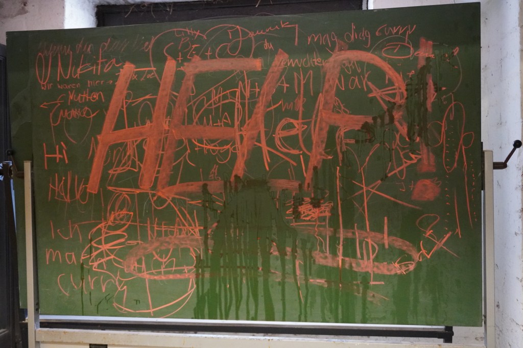 Aber es war nicht nur eine ganz normale beschriftete Kreidetafel, da das Wort, welches am meisten ins Auge sticht, weil es nur groß und in rot geschrieben wurde, HELP war: