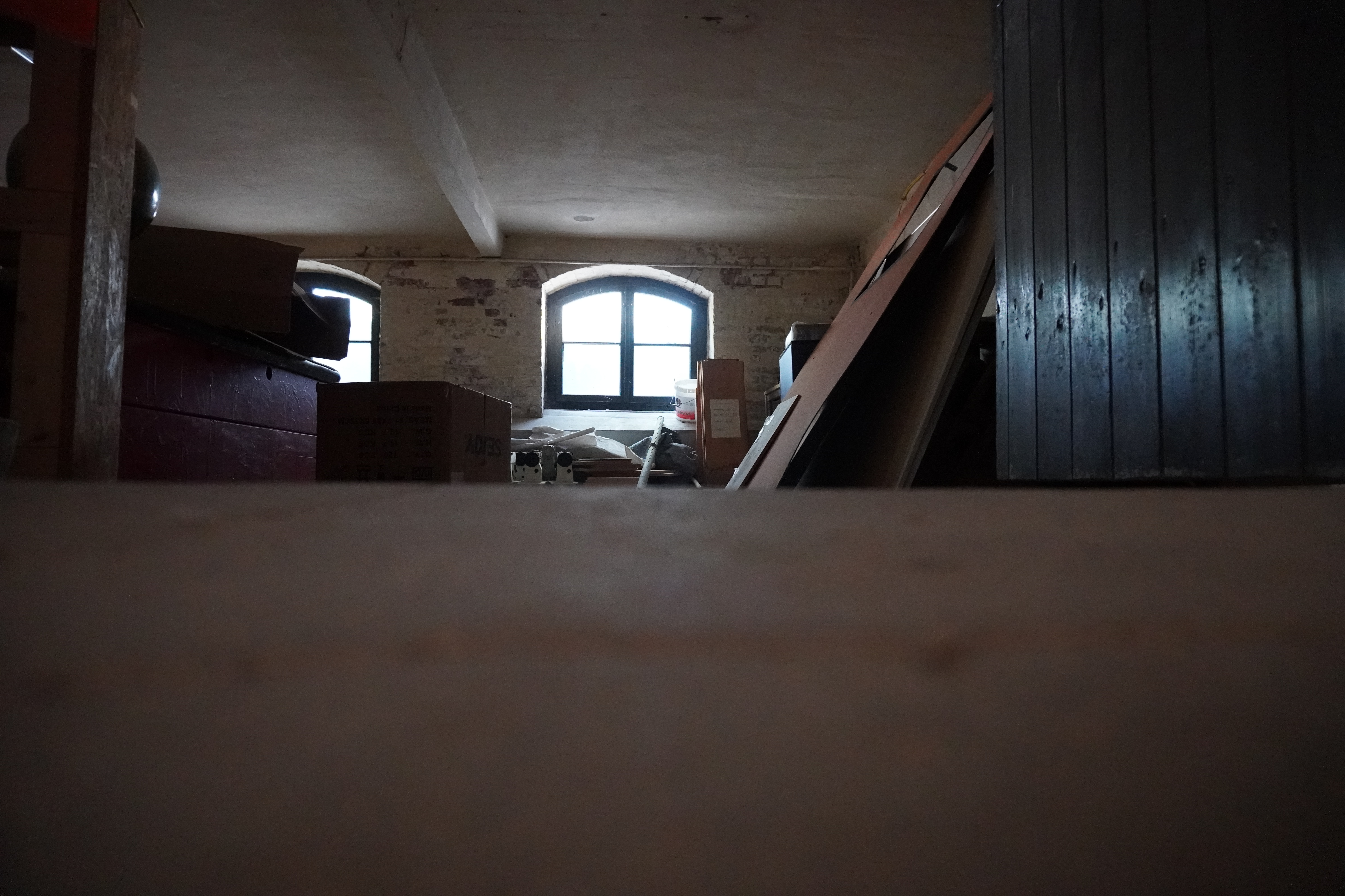 Wir gehen nur ein paar Schritte weiter und uns fallen direkt Spinnenweben ins Gesicht. Nach wenigen Sekunden steigt uns der strenge Geruch von alten Kartons in die Nase und wir bemerken den ganzen Staub, der überall verteilt ist.