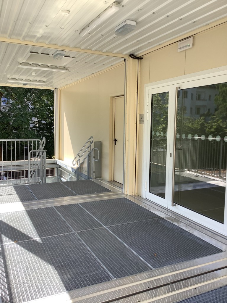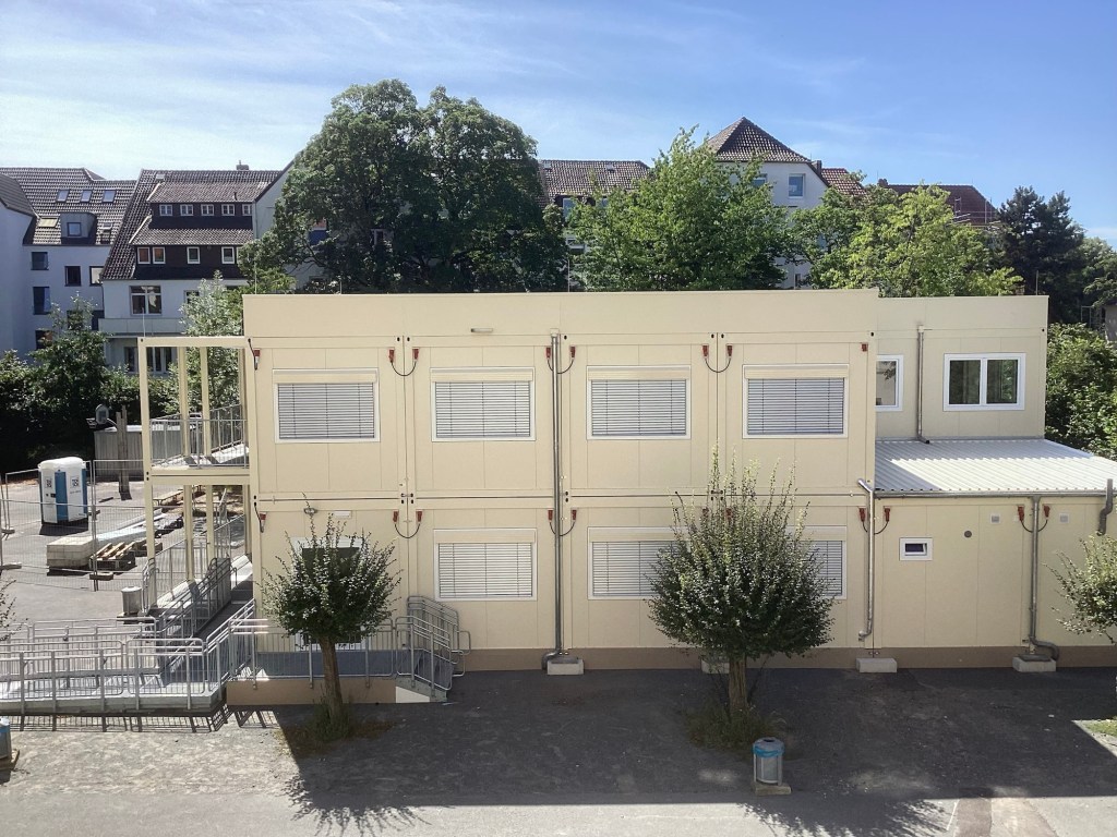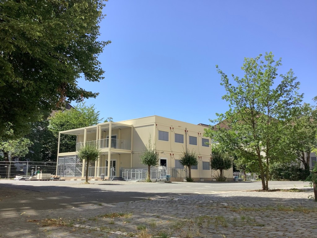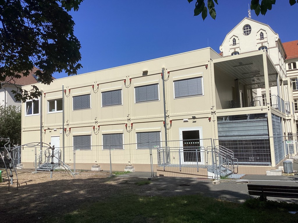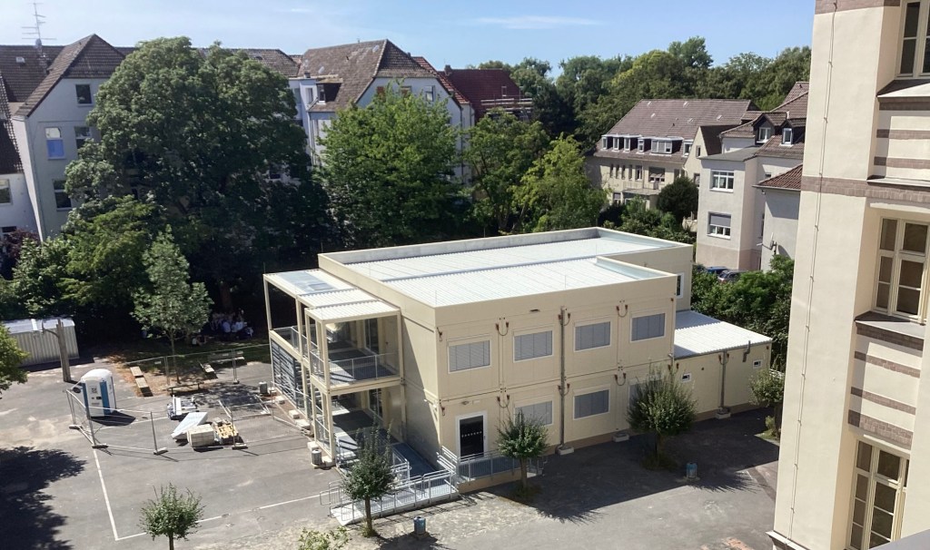 gibt, wurde nun auf dem Schulhof ein Gebäude aus Containern aufgestellt.