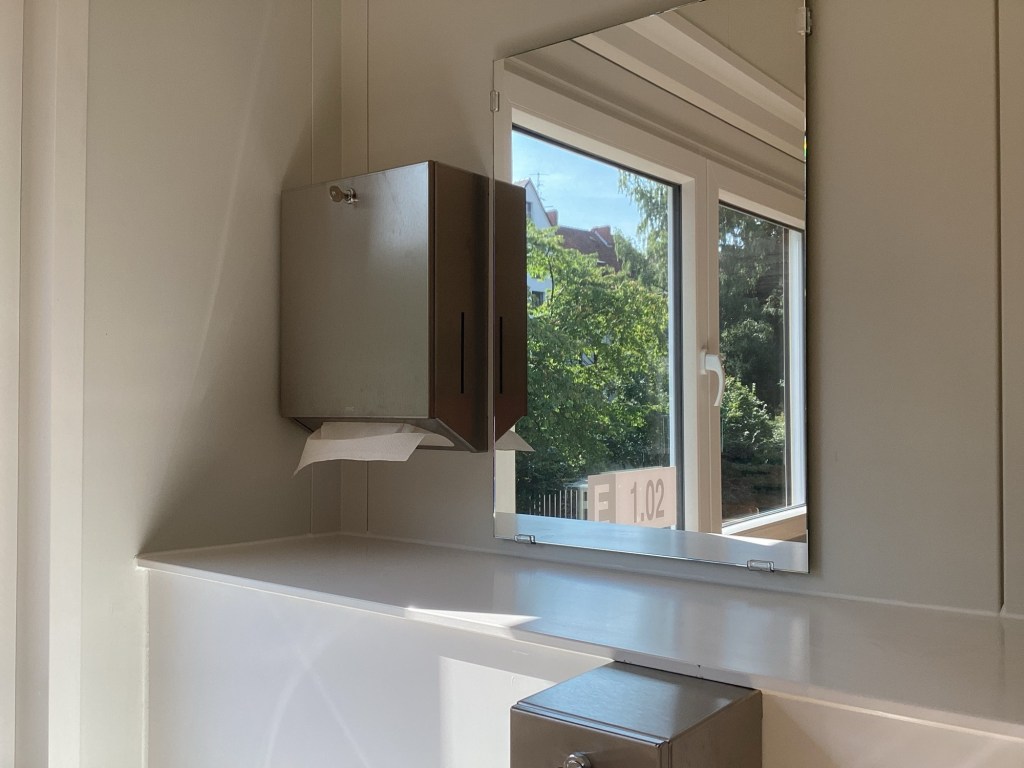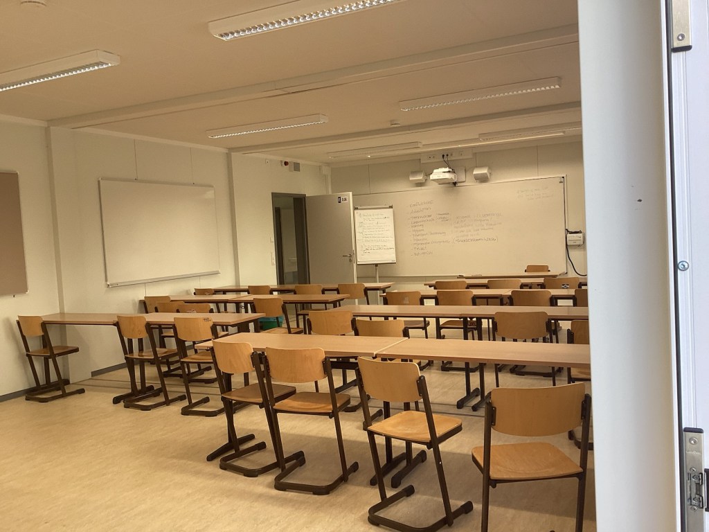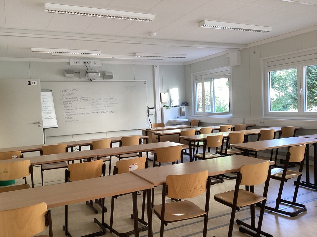 Modern, aber leer sieht es aus: Die Klassenräume wirken groß, hell und gut ausgestattet, aber auch ein bisschen anonym. Total auffallend: Die Container wirken von außen kleiner, innen bieten sie aber viel Platz – den man aber auch nutzen sollte, um ein bisschen zu gestalten: für Pflanzen, Plakate, Dekoration etc.