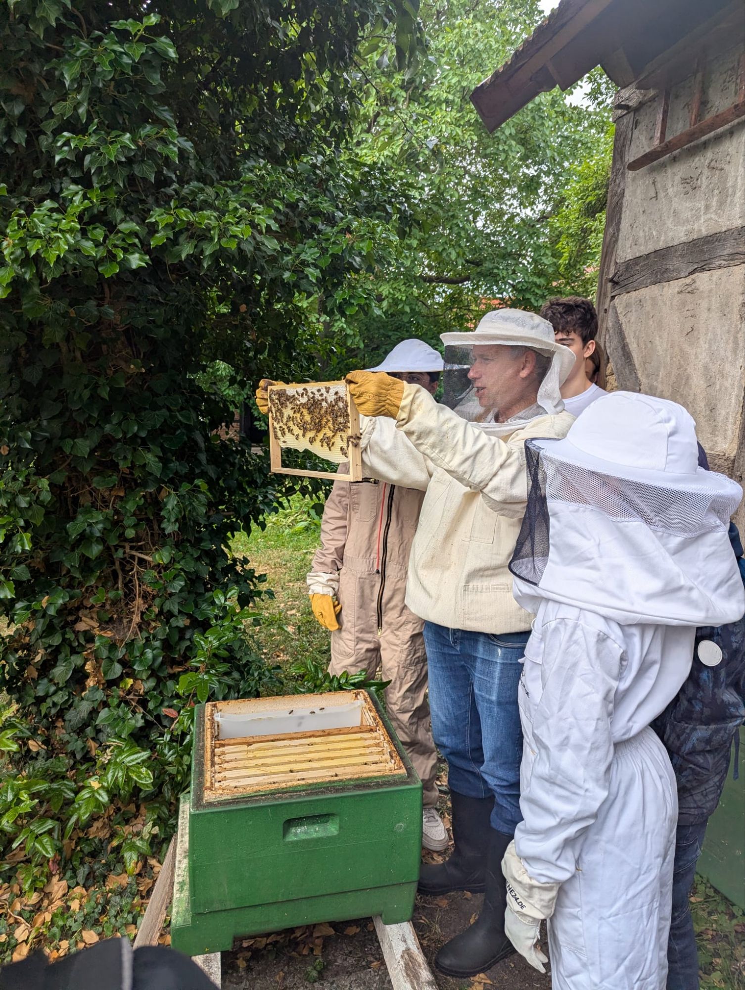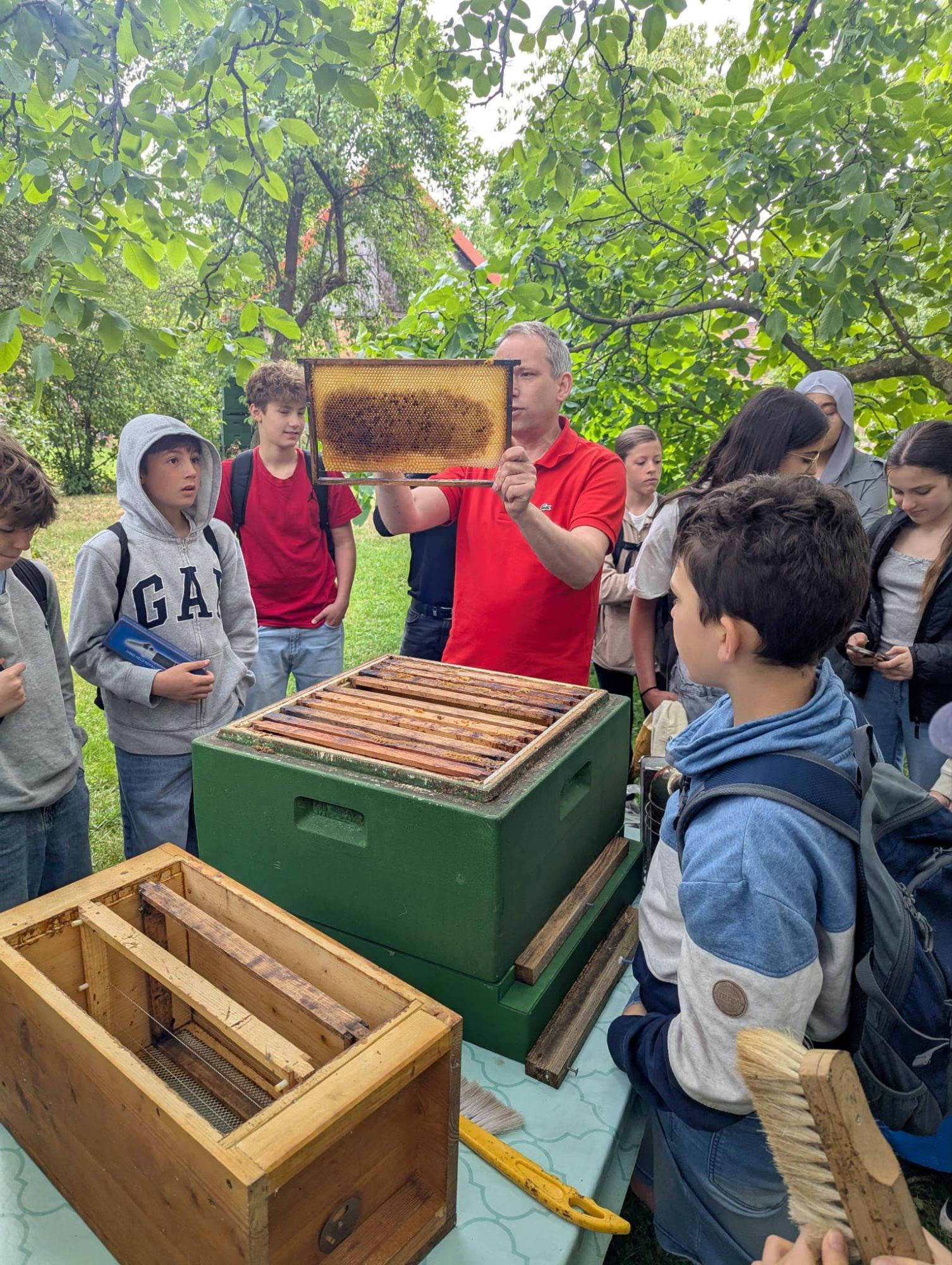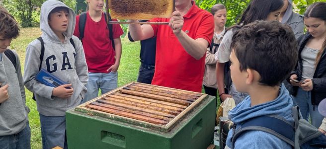 Gestern sind die Schülerinnen und Schüler zu Herrn Stürmers gefahren, der in seinem Garten hobbymäßig imkert. Herr Stürmer hat ihnen die verschiedenen Aufgaben des Bienenvolks erklärt und die SuS durften sich sogar die Bienenkönigin und Honigwaben genauer anschauen.