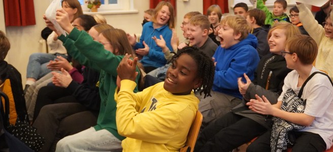 Ein heller Raum voller gespannter Zuschauer und sechs besonders aufgeregte Schüler/-innen mit ihrem Buch auf dem Schoß: Gleich müssen sie zeigen, was sie können! Und dann betritt Frau Huth die Bühne…