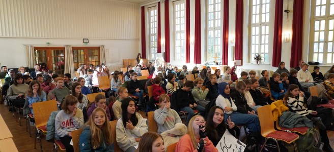 Am Montag trafen in der 5/6 Sunden alle SuS der 6. Klassen mit deren Lehrkräften in der Pauluskirche ein. Nachdem alle da waren, begann Frau Huth erstmal alles ganz genau zu erklären. In der ersten Runde lasen die Kandidaten 3 Minuten aus einem selbst ausgesuchten Buch vor. Danach wurde aus dem Buch das Frau Huth ausgesucht hatte vorgelesen. Es war Drachenreiter von Cornelia Funke. In der Jury saßen einige Deutschlehrer/-innen, Elternvertreter/-innen und zwei Schülerinnen aus der 11. Klasse. Starke Leser/-innen begannen den Kampf um den ersten Platz. Aus der 6A kandidierten Lola Schnell & Rieke Maier, aus der 6B Jonas Hillmann & Kausar Hosseini und aus der 6C Julius Goldschmidt & Ayman Ouaacha.